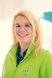 Praxismanagerin Sabrina Sierks ist eine blonde junge Frau mit Brille, die freundlich in die Kamera lächelt. Sie trägt eine hellgrüne Sweatjacke mit dem Logo der TCM-Praxis auf der Brust.